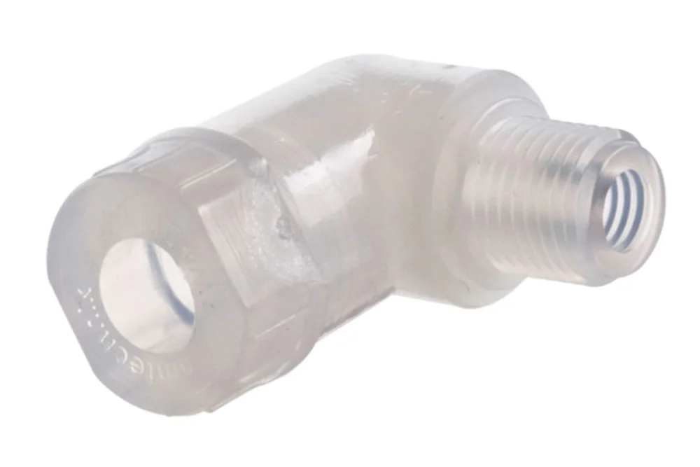 90°-kobling for slange med utvendig BSP-gjenge, type EM, finner bred anvendelse i laboratorier, medisin, farmasøytisk, kjemisk og næringsmiddelindustri. Konstruksjonen muliggjør gjentatt montering uten bruk av verktøy. Serie 1W+ krever ikke utjevning av riller på slangekoblingene. Den er beregnet for fleksible, korrugerte slanger med glatt innvendig overflate og ikke-forsterkede teflonslanger (PTFE). Materiale: PVDF. Arbeidstrykk: 4 bar.