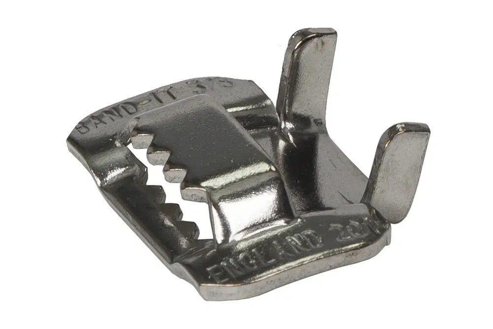 Band-It® Standard båndspenner. Spenner med såkalte «neser» sikrer enden av båndet etter bøying. Materiale: AISI 304 stål.