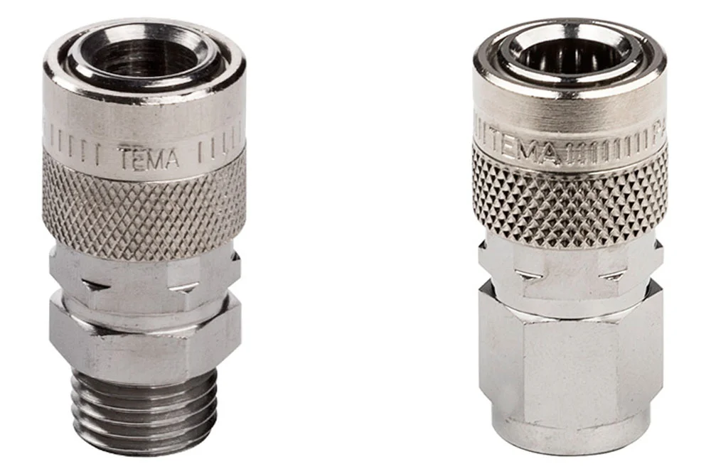 Universell hurtigkoblingskontakt med utvendig eller innvendig BSP-gjenge, primært beregnet for trykkluft og gasser, for mindre verktøy og pneumatiske systemer. Enkel å bruke, holdbar, og kjennetegnes av god gjennomstrømning ved små ytre dimensjoner. Kontakten er laget av krom-nikkelbelagt messing, med fjærer og kuler i rustfritt stål. Koblinger i serie 1100 skal ikke kobles med serie 1100N. Kapasitet: 580 l/min, Pe=6 bar, Δp=0,5 bar (luft). Arbeidstrykk: 30 bar. Arbeidstemperatur: fra -20°C til +100°C (NBR), fra -25°C til +200°C (viton – alternativ), fra -50°C til +150°C (EPDM – alternativ), avhengig av medium.