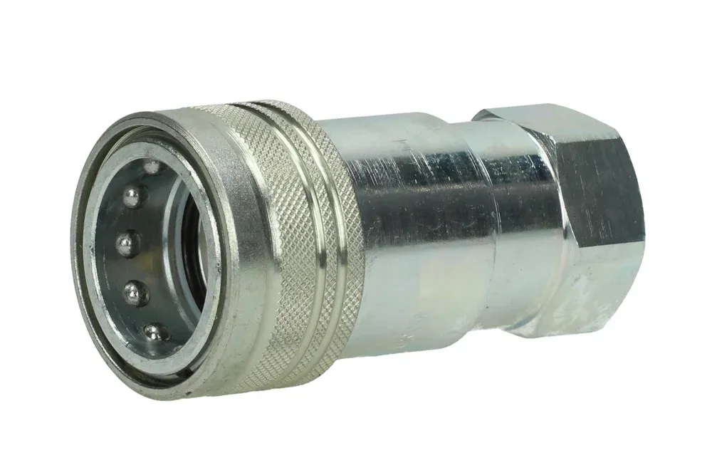 Hydraulisk ISO-A hurtigkoblingskontakt med avstengningsventil og innvendig BSP-gjenge. Bruksområde: kraftoverføringshydraulikk (hydraulikkolje). Hurtigkoblingen brukes hovedsakelig i landbruksmaskiner. Vanligvis kalt «eurokoblinger». Kompatibel med ISO-A hurtigkoblinger fra andre produsenter. Materiale: galvanisert stål. Tetning av kontakten: NBR (arbeidstemperatur fra -25°C til +100°C). Arbeidstrykk: opptil 350 bar (avhengig av størrelsen på hurtigkoblingen). Sikkerhetsfaktor 4:1. Strømning er oppgitt ved Δp = 3 bar [l/min].