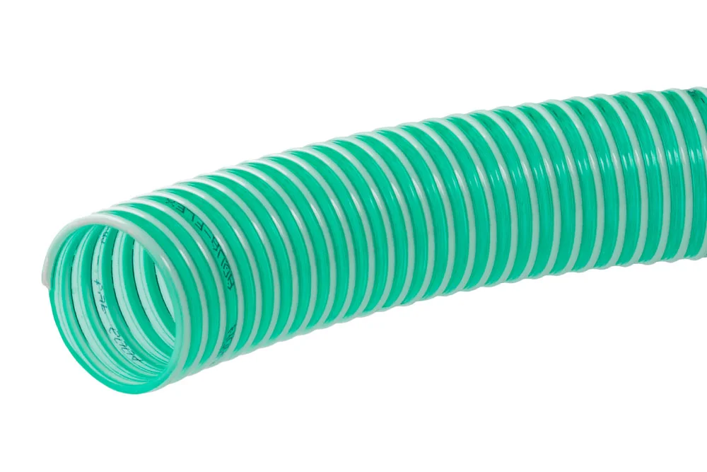 Lett, fleksibel, økonomisk suge- og trykkslange for universelle applikasjoner. Glatt innvendig, lett korrugert utvendig. Beregnet for vann, lette kjemikalier, slam og avløpsvann, plantevernmidler, andre væsker (unngå fett, oljer og hydrokarboner). Også for luft, vakuumtransport av støv, pulver, lette granulater og andre lett slipende bulkmaterialer. Det bør da tas hensyn til slitasje og eventuelle problemer med statisk elektrisitet. Bredt brukt i landbruk, hagebruk og husholdningsapplikasjoner. Slangemateriale: grønn gjennomsiktig PVC. Forsterkning: hvit spiral av hard PVC. Vakuum for temperatur 20°C: 0,6 bar. Arbeidstemperatur: fra -20°C til +60°C. Med økende arbeidstemperatur reduseres slangens arbeidsvakuumverdi.
