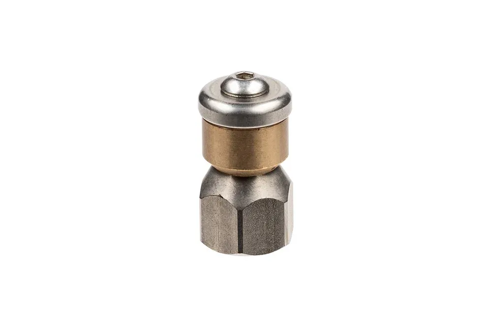 Rotasjonsdyse RM for rensing av avløp uten sentrisk hull. Tilkobling: GW 1/4″ BSP. Materiale: rustfritt stål (kropp), messing (rotor). Arbeidstrykk: opptil 150 bar. Diameter: 19 mm.