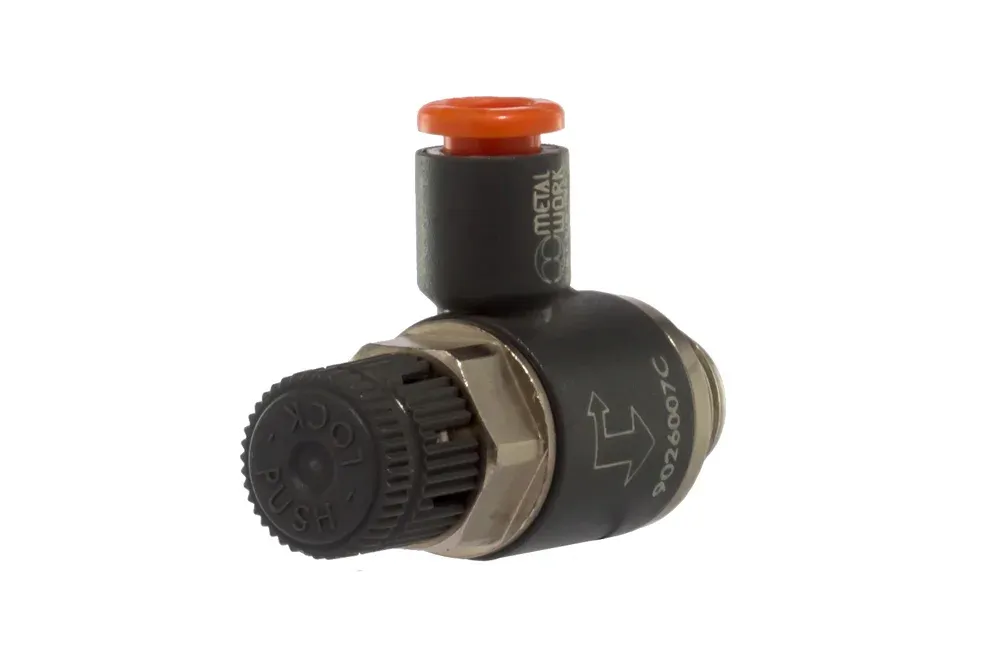 Strupe-tilbakeslagsventil type MRF PTC serie PUSH-LOCK for direkte montering i aktuatorforbindelser, brukt i pneumatiske systemer for å regulere strømningshastigheten av komprimert luft og strømningsretningen. Utstyrt med en plug-in-kobling som sikrer enkel demontering av pneumatiske slanger. Justering ved hjelp av et ratt med PUSH-LOCK-lås. Størrelse: 1/8″, 1/4″. Arbeidstrykk: opptil 10 bar. Arbeidstemperatur: fra -10°C til +50°C. Materiale: plast.