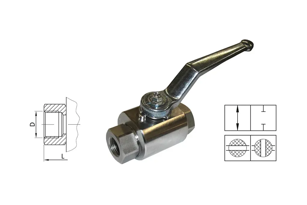 To-veis kuleventil av typen RKH med innvendig BSP-gjenge, beregnet for høytrykks hydrauliske og industrielle installasjoner. For riktig valg av ventil for medier andre enn hydraulikkolje og for høye arbeidstemperaturer, bør man konsultere Tubes International. Materiale: rustfritt stål AISI 316Ti (kropp, kule, spindel). Tetninger: POM eller PTFE (kule), NBR eller FKM (spindel). Arbeidstemperatur: fra -40°C til +100°C (POM); fra -200°C til +250°C (PTFE); fra -20°C til +100°C (NBR); fra -20°C til +200°C (FKM).